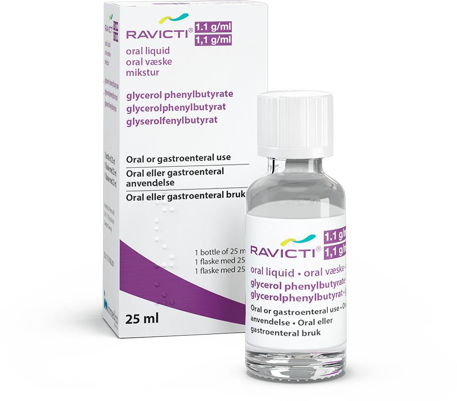 RAVICTI® (fenylomaślan glicerolu) to lek stosowany w leczeniu pacjentów w każdym wieku cierpiących na UCD. Ten lek stosuje się w celu zmniejszenia ilości amoniaku we krwi, by zmniejszyć ryzyko wystąpienia następstw neurologicznych.1